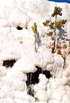 Des concrétions calcaires blanches se sont formées sur les herbes et sur les roches, créant de gigantesques vasques, alimentées par des sources d'eau chaude à 53°C gorgée de carbonate de calcium. Le soleil pare ce chef-d'oeuvre naturel des couleurs les plus étonnantes : rose doré au petit matin, blanc éclatant en plein midi, et mauve en fin de journée.